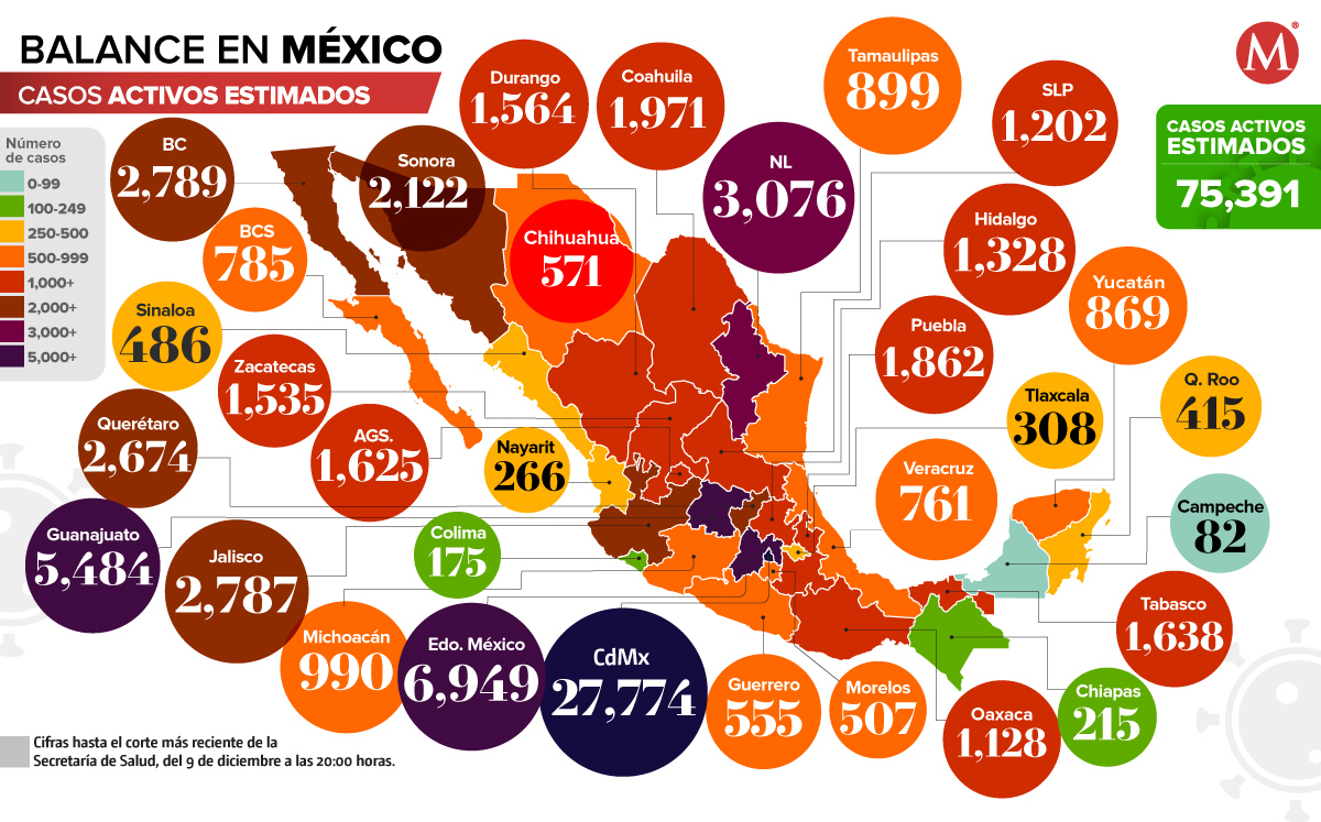 La Ciudad de México y el Estado de México son los estados que más casos activos estimados tienen; mientras que Campeche tiene la menor cantidad.