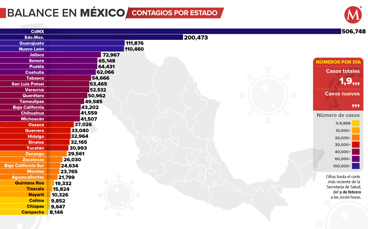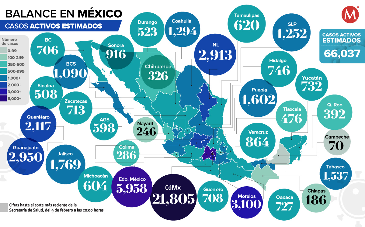 La Ciudad de México y el Estado de México son las entidades con mayor número de casos activos estimados de coronavirus; mientras que Campeche tiene la menor cifra.