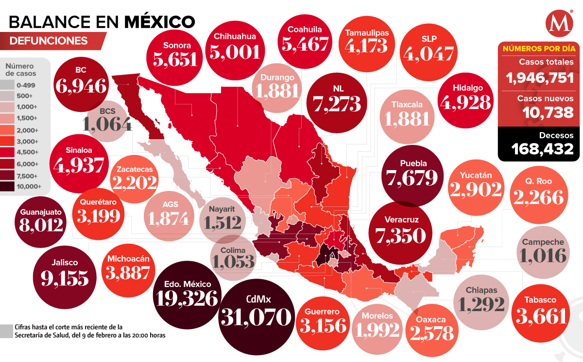 La Ciudad de México y el Estado de México son las entidades con más muertes por coronavirus; mientras que Baja California Sur tiene la menor cifra.
