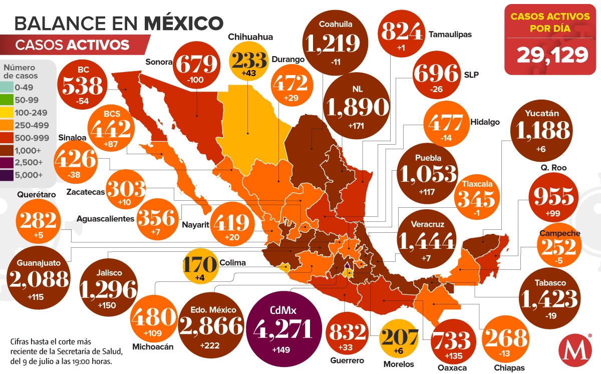 La Ciudad de México, el Estado de México y Guanajuato son las entidades con más casos activos de covid-19, y son las únicas entidades que tienen más de dos mil pacientes con síntomas de la enfermedad.