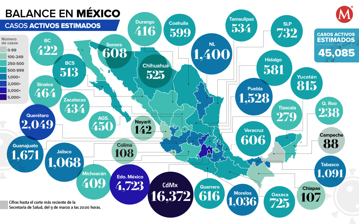 La Ciudad de México y el Estado de México tienen la mayor cantidad de casos activos estimados de coronavirus; mientras que Campeche tiene la menor cifra.