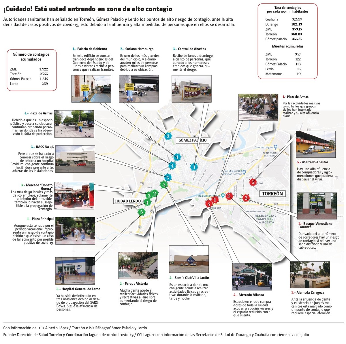 A través de las acciones emprendidas por la Coordinación regional de Protección Civil de Durango en La Laguna, a cargo de Daniel Ríos Reyna, se identificaron los espacios con mayor riesgo de propagación del virus en Gómez Palacio y Lerdo con la instalación de anuncios, lo cuales tenían la leyenda “Zona de Alto Riesgo”.