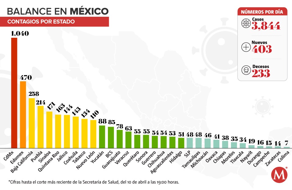 La capital del país, el Estado de México, Baja California y Puebla son las únicas entidades que han superado los 200 casos; mientras que seis estados tienen entre 100 y 199 contagios; mientras que el resto de las entidades tiene menos de cien infectados.