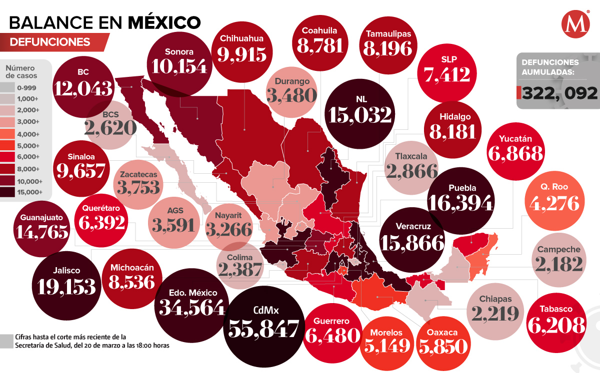 Este domingo se registraron 20 muertes, por lo que hay un total de 322 mil 022 defunciones por el virus SARS-CoV-2. En Ciudad de México hay 55 mil 847 decesos acumulados, Estado de México confirma 34 mil 564, en Jalisco hay 19 mil 153, Puebla registra 16 mil 394 y Veracruz tiene 15 mil 886.