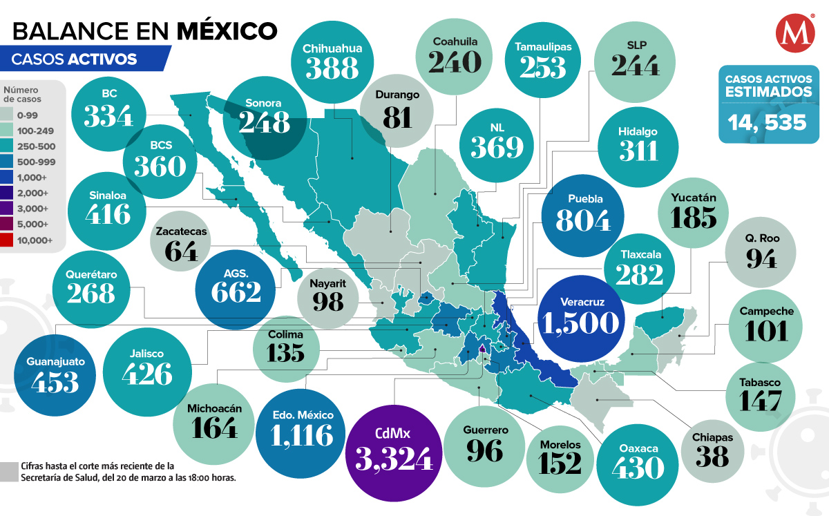En Ciudad de México se estiman 3 mil 324 casos, Veracruz con mil 500, Estado de México con mil 116 suman la terna de las entidades con más casos activos.
