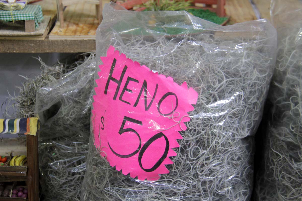 Dolores García, atiende el ubicado por la avenida Hidalgo, en el exterior del mercado se puede encontrar todos los implementos básicos para el nacimiento, como el musgo, el heno, la gobernadora, pequeños portalitos y papel tipo roca o ladrillo.