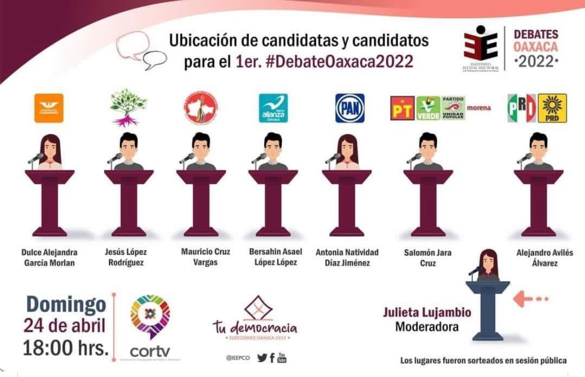 La presidenta del Consejo General del IEEyPCO, Elizabeth Sánchez, afirmó que el primer debate entre los aspirantes se desarrollará este domingo 24 de abril, y será transmitido a las 18:00 horas por la plataforma del canal de televisión estatal y estará moderado por la periodista Julieta Lujambio.