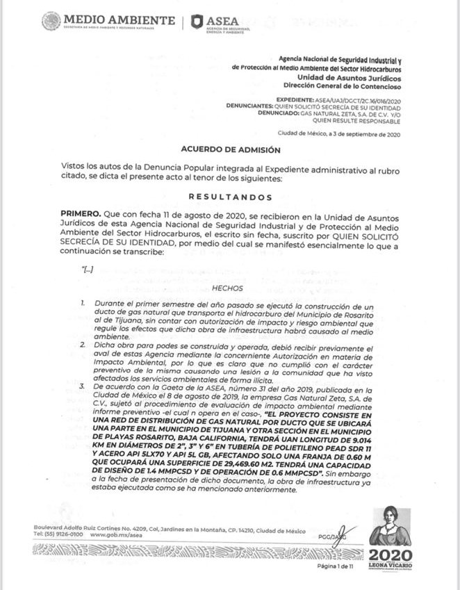 En la queja se narra que durante el primer trimestre del año pasado la empresa ejecutó la construcción de un ducto de gas natural que transporta el hidrocarburo del municipio de Rosarito al de Tijuana.