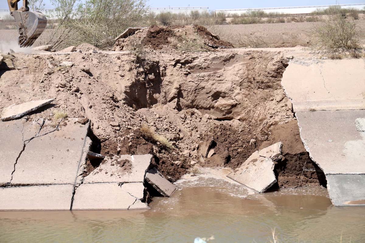 Un enorme hoyo se formó en la pared de concreto que recubre el canal de riego Sacramento en Gómez Palacio, lo que provocó que el agua saliera del cauce e inundará parte de una pequeña propiedad. El problema fue solucionado por personal de Conagua, cubriéndolo de momento con tierra.