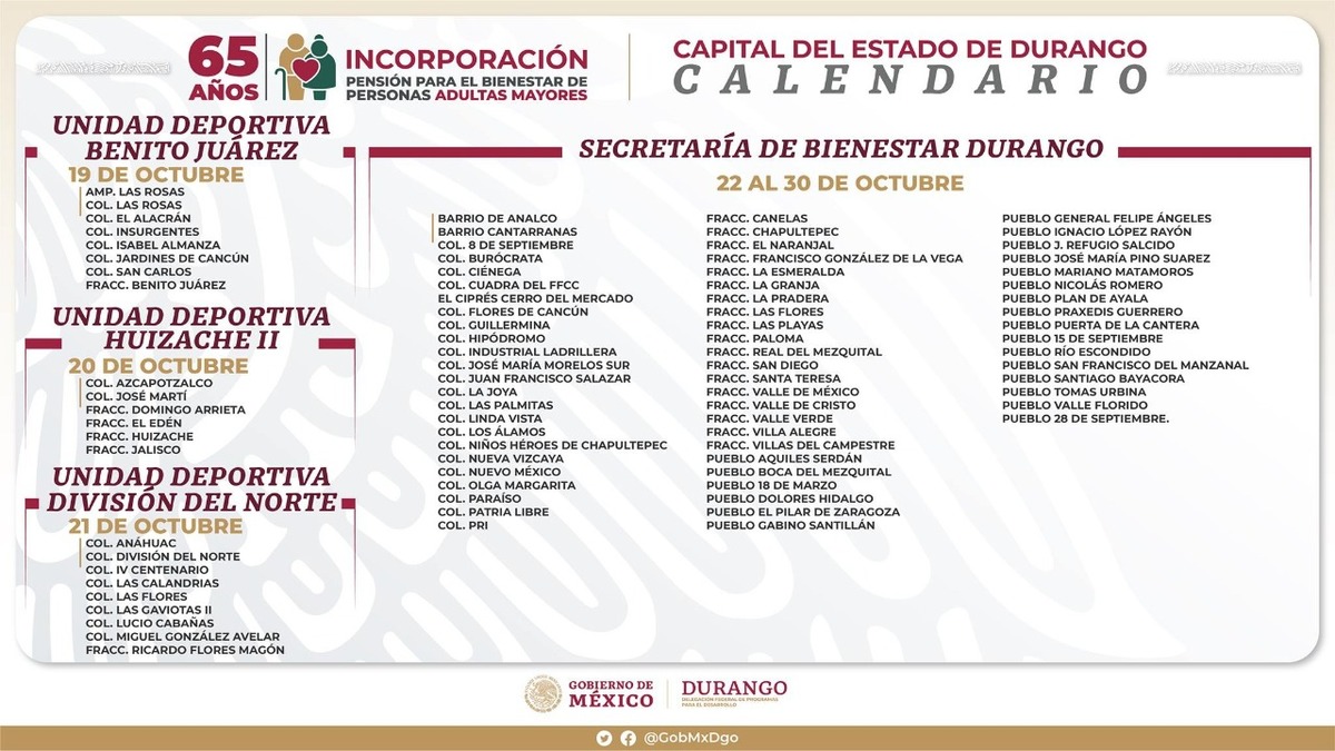 Este martes 19 de octubre continúa incorporación de adultos mayores de 65 años de edad para recibir la pensión Bienestar en el estado de Durango.