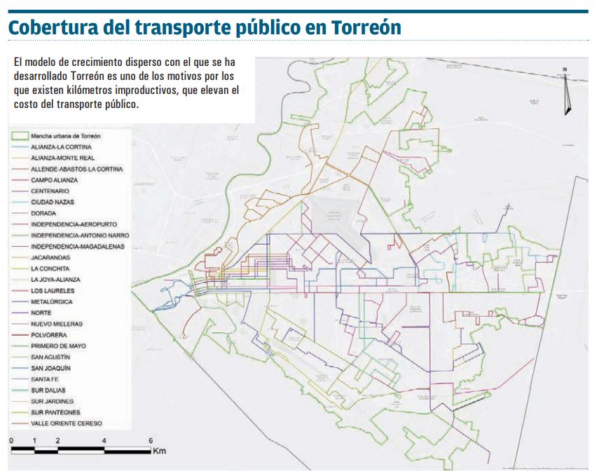 El modelo de crecimiento disperso con el que se ha desarrollado la mancha urbana de Torreón es uno de los motivos por los que existen estos “kilómetros improductivos”, que elevan el costo del transporte urbano.