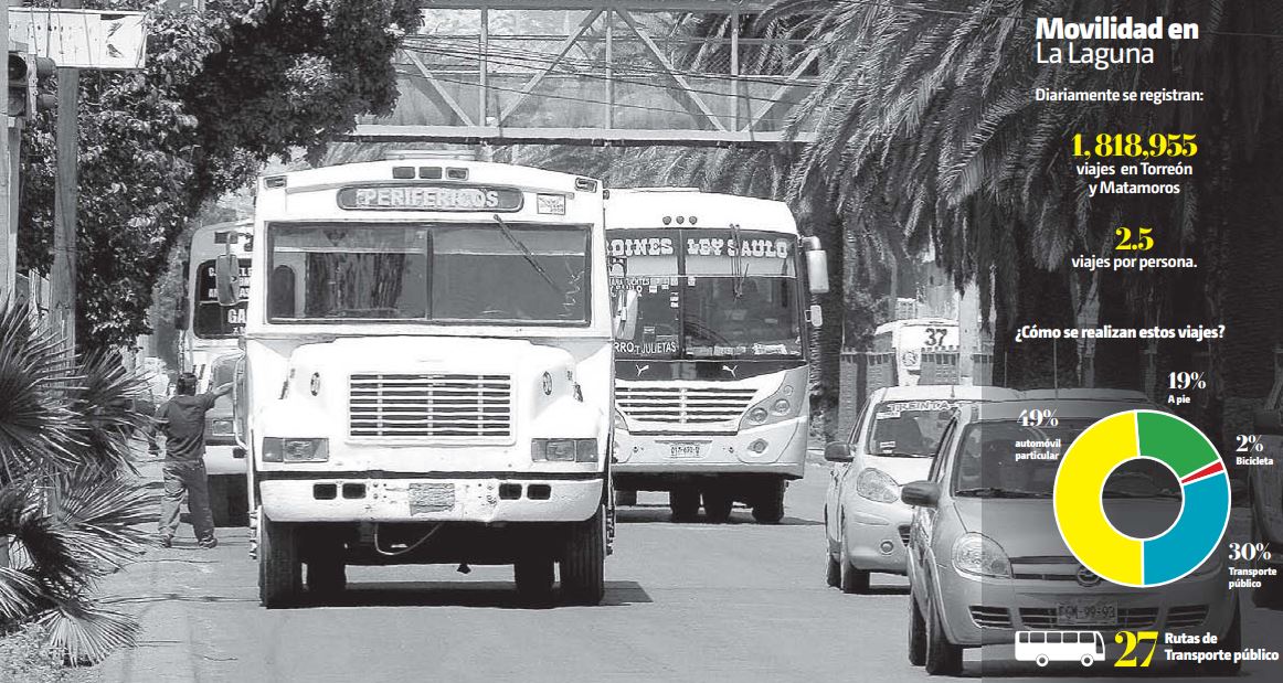 El índice de motorización es de 275 vehículos registrados por cada mil habitantes, es decir, un auto por cada 3.6 habitantes y diariamente se registran 1,818,955 viajes en los municipios de Torreón y Matamoros que equivale a 2.5 viajes por persona.