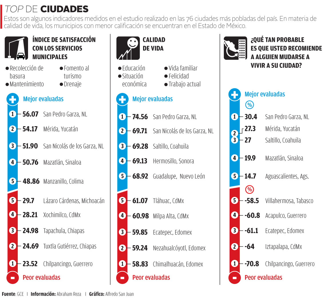 De acuerdo con las opiniones de la ciudadanía entrevistada, en un rango de 0 a 100 puntos las cuatro ciudades con mayor índice de calidad de vida son: San Pedro Garza García (74.56) y San Nicolás de los Garza García (69.71), Nuevo León; Saltillo (69.28), Coahuila, y Hermosillo, Sonora (69.13), mientras que las que se encuentran en los últimos lugares de la lista son Chimalhuacán (58.83), Nezahualcóyotl (59.24) y Ecatepec (59.85), Estado de México; Chilpancingo (61.13), Guerrero, y Tlaquepaque (61.17), Jalisco.