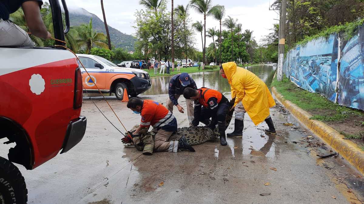 Un cocodrilo de aproximadamente 2.5 metros de longitud apareció en la zona Diamante de Acapulco y fue capturado por personal de Protección Civil de Guerrero en las inmediaciones del acceso principal de la playa Revolcadero.