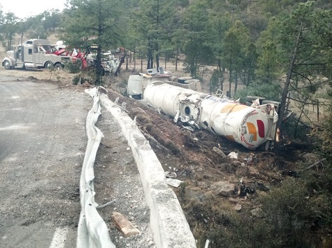 El derrame fue provocado por la volcadura de un tracto camión de quinta rueda de la empresa ASTRON, que iba a alta velocidad y causó el percance a la altura del kilometro 234 de la carretera federal 16.