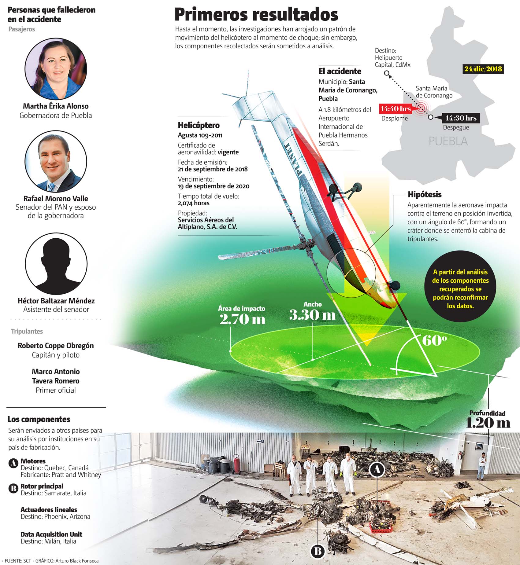 De acuerdo con la investigación de campo que los especialistas internacionales realizaron en la zona donde se desplomó el helicóptero en el que murieron la gobernadora de Puebla, Martha Érika Alonso; su esposo, el senador Rafael Moreno Valle, y tres tripulantes más, la aeronave tuvo “una caída inusual” con una “actitud invertida con un ángulo de 60 grados” que pudo haber sido provocado por diferentes factores.