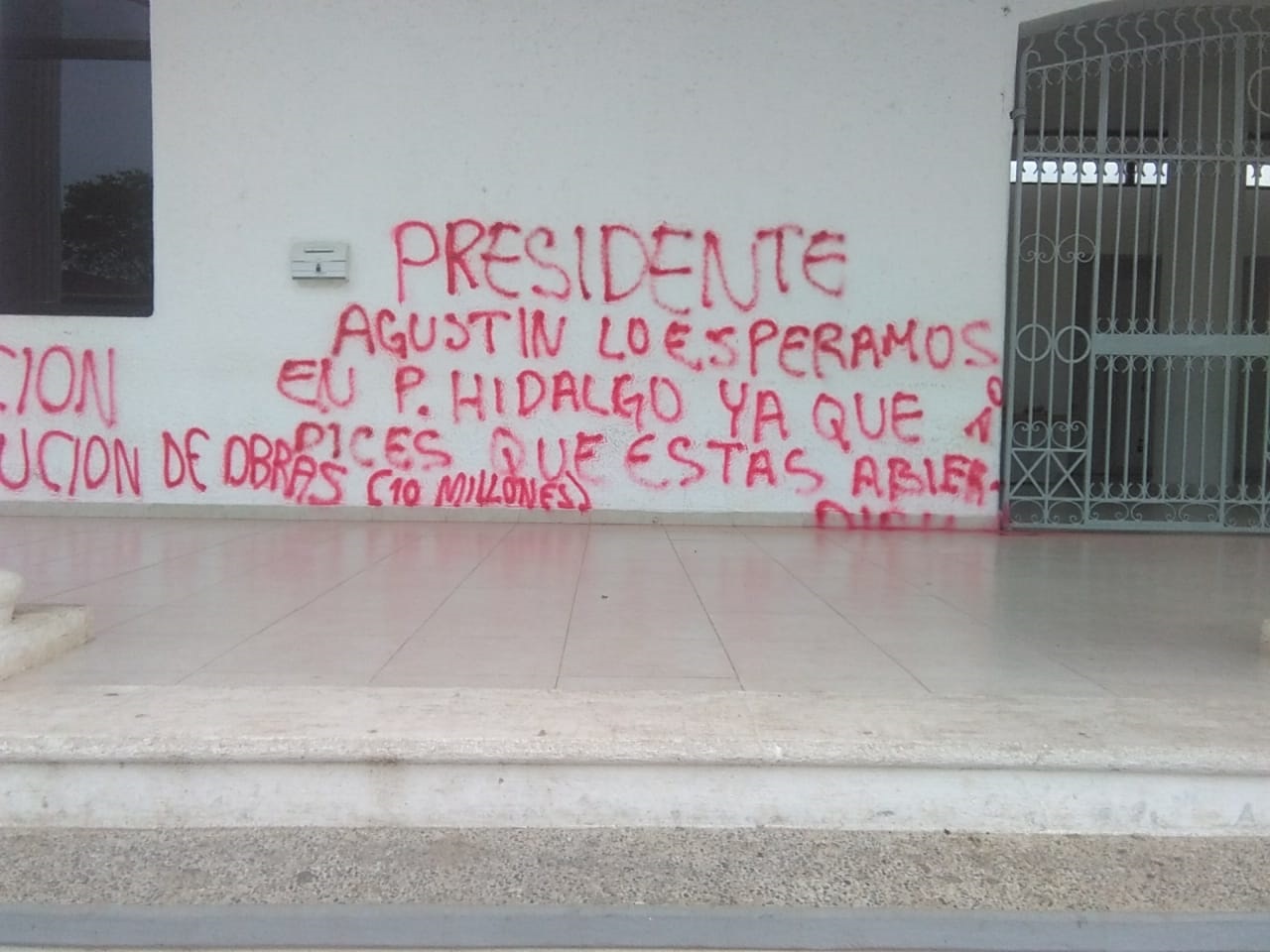 “Presidente Agustín, lo esperamos en P. Hidalgo, ya que dices que estás abierto al diálogo. Exigimos la liberación de los recursos para la ejecución de obras de obras (diez millones de pesos)”, dice la pinta.