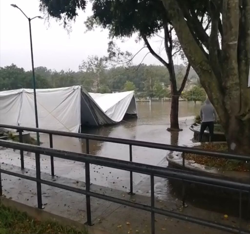 Esta tarde, el módulo de vacunación para adultos de 50 a 59 años, y mujeres embarazadas mayores de 18 años tuvo que cerrar, debido a que la inundación dejó prácticamente bajo el agua los puntos donde se aplicaba la vacuna bajo una carpa ubicada en unas canchas de futbol.