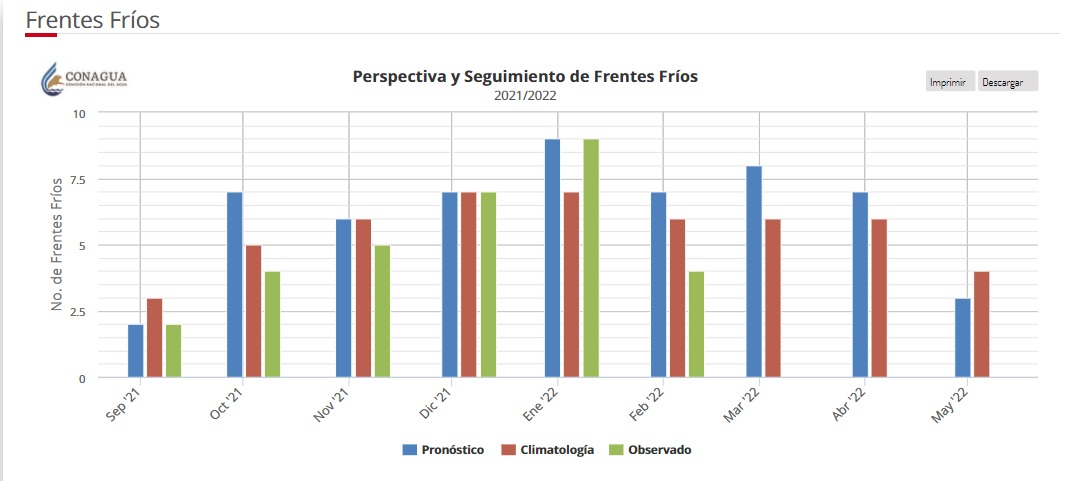 El Servicio Meteorológico Nacional (SMN), encargado de proveer pronósticos, alertas e información del estado del tiempo y del clima para el país, pronosticó 56 frentes fríos para esta temporada 2021-2022.