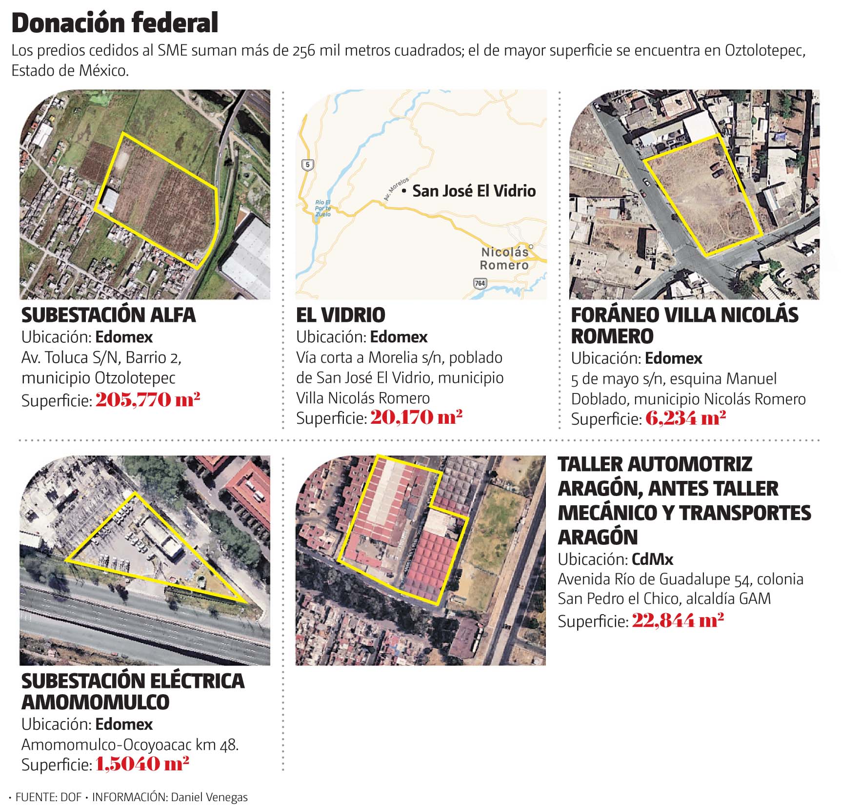 El cuarto tiene una superficie de mil 504 metros cuadrados y se ubica en un rancho de San Antonio Amomolulco, distrito de Lerma, Estado de México, y el quinto es el predio El Vidrio, con superficie de 20 mil 170 metros cuadrados, localizado en el poblado de San José El Vidrio, en Tlalnepantla.