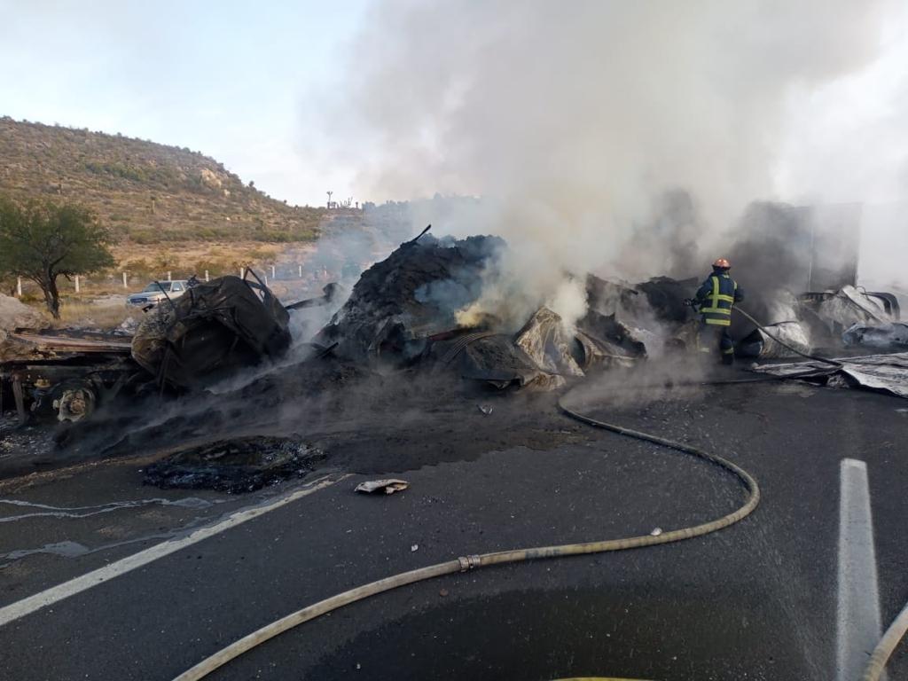 La circulación en dirección hacia Matehuala quedó interrumpida en ambos carriles, en tanto los cuerpos de emergencia lograron apagar las unidades incendiadas.