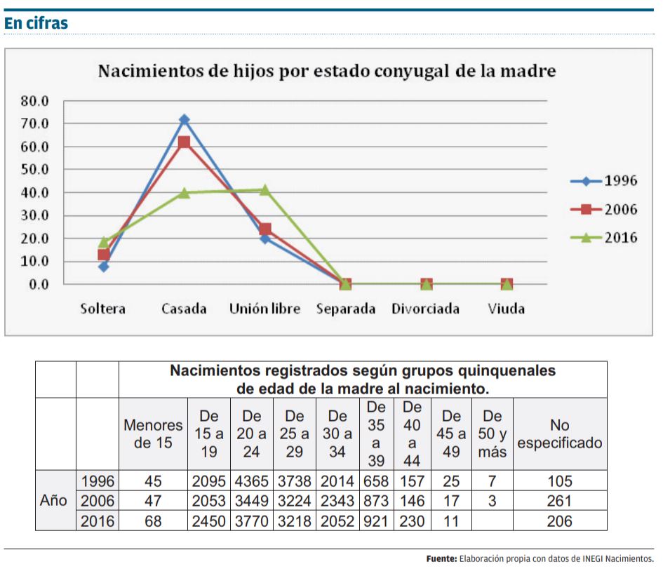En las últimas tres décadas la tendencia en el municipio ha sido la disminución en los matrimonios, sin embargo, los nacimientos en madres solteras y en unión libre han aumentado, y en madres casadas ha disminuido considerablemente en comparación con 2006 y 2016.