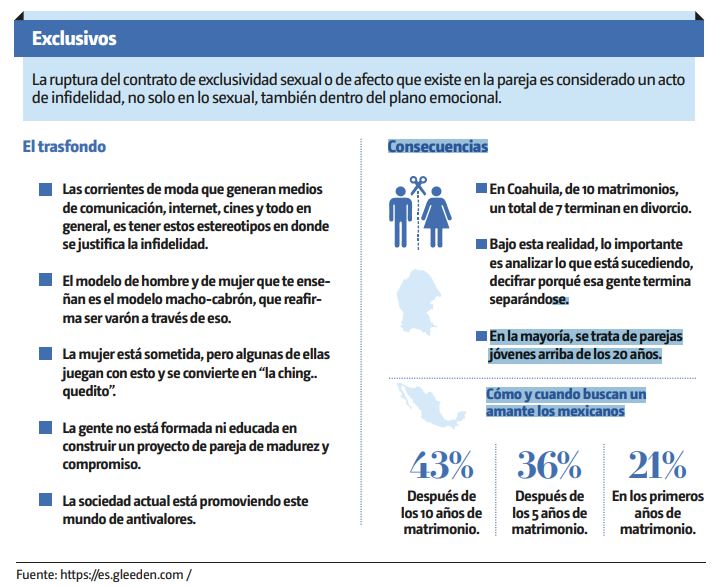 Reveló que uno de los motivos más comunes por el que las parejas acuden a la atención psicológica en el área de terapia de pareja es la infidelidad, “alrededor del 30 a 40 por ciento de la consulta que normalmente llega con nosotros, suele ser por esa causa”.