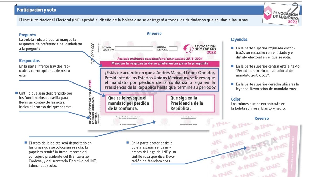 La jornada del ejercicio de revocación de mandato está pactado iniciar en punto de las 8:00 horas del 10 de abril, para concluir a partir de las 18:00 horas, sin embargo, en caso de que lleguen más ciudadanos, por mandato normativo, permanecerán hasta atender a la última persona.