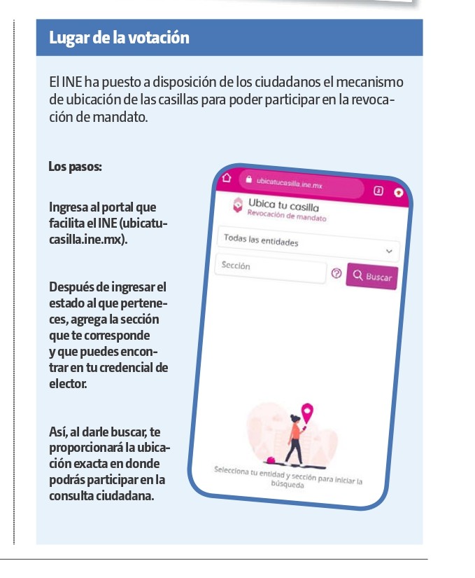 Asimismo estará a disposición del público elector la herramienta digital Ubica tu Casilla que facilita la localización del lugar donde se podrá votar. https://ubicatucasilla.ine.mx/