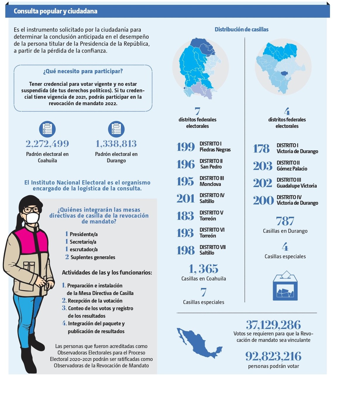 Está todo listo en La Laguna para la jornada de la revocación de mandato el próximo 10 de abril, sobre todo están aseguradas las mil 365 casillas electorales en Coahuila y un total de 787 en el estado de Durango, mismas que forman parte de las 57 mil 516 que estarán disponibles en todo el país.