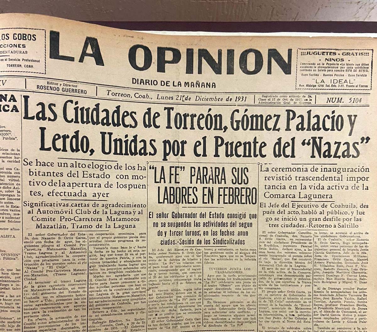El historiador Carlos Castañón Cuadros explica que por eso nació cuatro años después el puente de la calle Ramos Arizpe que hoy es el que siguen las rutas de transporte Torreón-Gómez-Lerdo.
