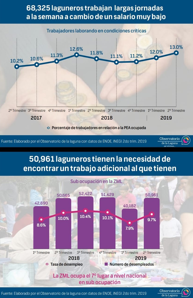 El Informe también revela que 68 mil 325 laguneros trabajan largar jornadas por un salario mínimo, es decir, un 13% de la población económicamente activa.