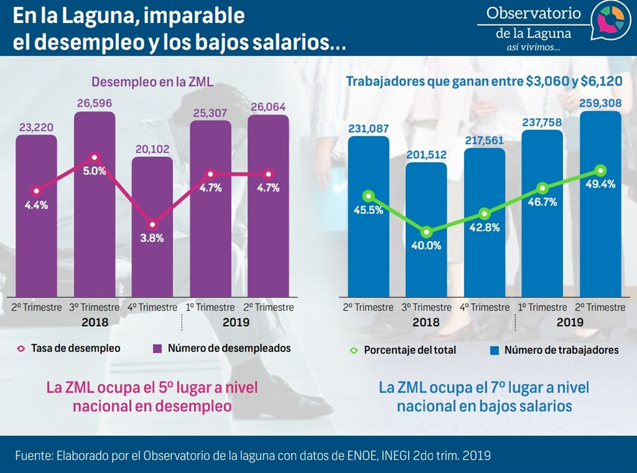 La Zona Metropolitana de La Laguna mantiene el 5° lugar a nivel nacional en desempleo, de acuerdo a la última entrega de la Encuesta Nacional de Empleo y Ocupación, con corte al segundo trimestre del 2019.