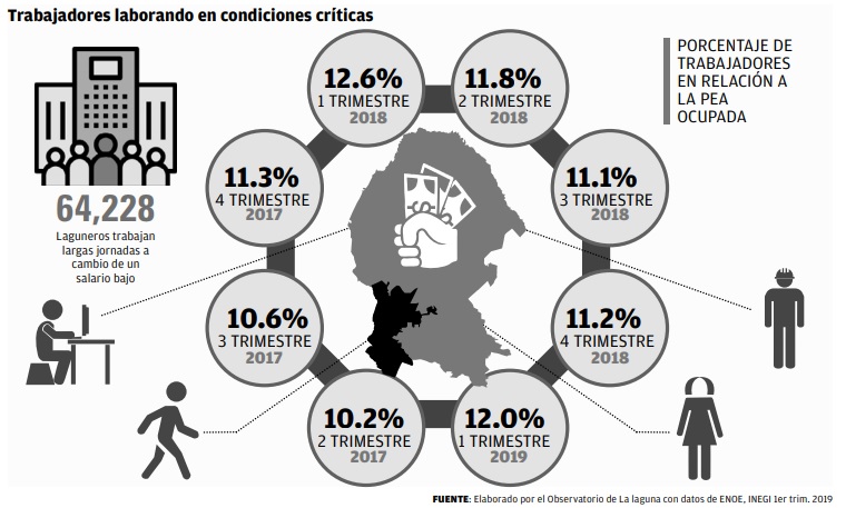 De igual forma, actualmente el análisis revela que 64 mil 228 laguneros trabajan largas jornadas a la semana a cambio de un salario muy bajo y cuyo porcentaje equivale a un 12 por ciento de la población trabajadora, cantidad que hace dos años era del 10.2 por ciento.