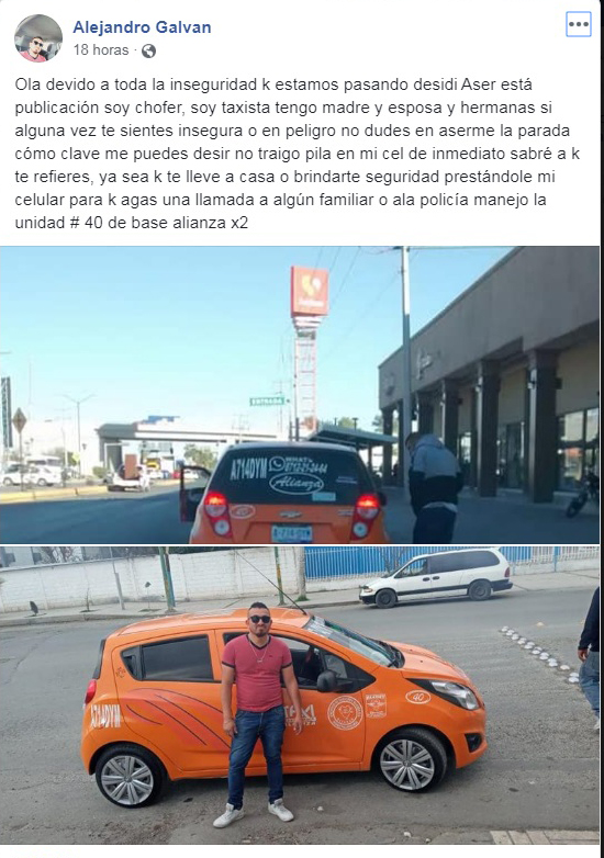 A través de redes sociales un chófer de taxi de Gómez Palacio se puso a disposición de mujeres que se sientan inseguras en las calles, si están siendo acosada podrán utilizar la frase "no traigo pila en mi celular".