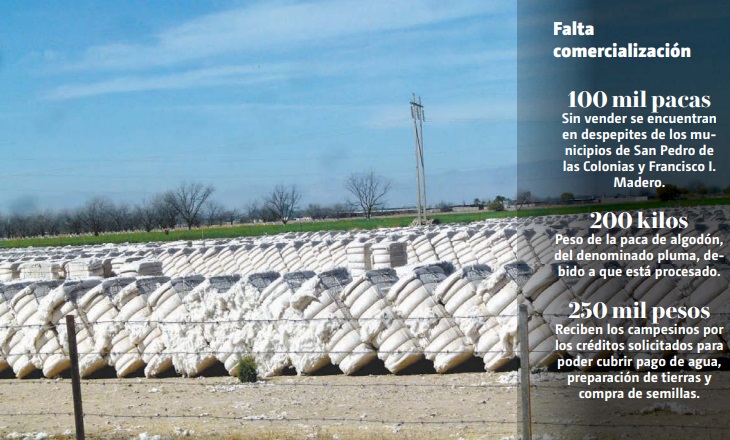 Se tiene un rezago de 80 a 100 mil pacas de algodón que no se han vendido en los municipios de Francisco I. Madero y San Pedro, según dio a conocer José Natividad Navarro Morales, presidente de la Confederación Nacional Campesina (CNC) en San Pedro.