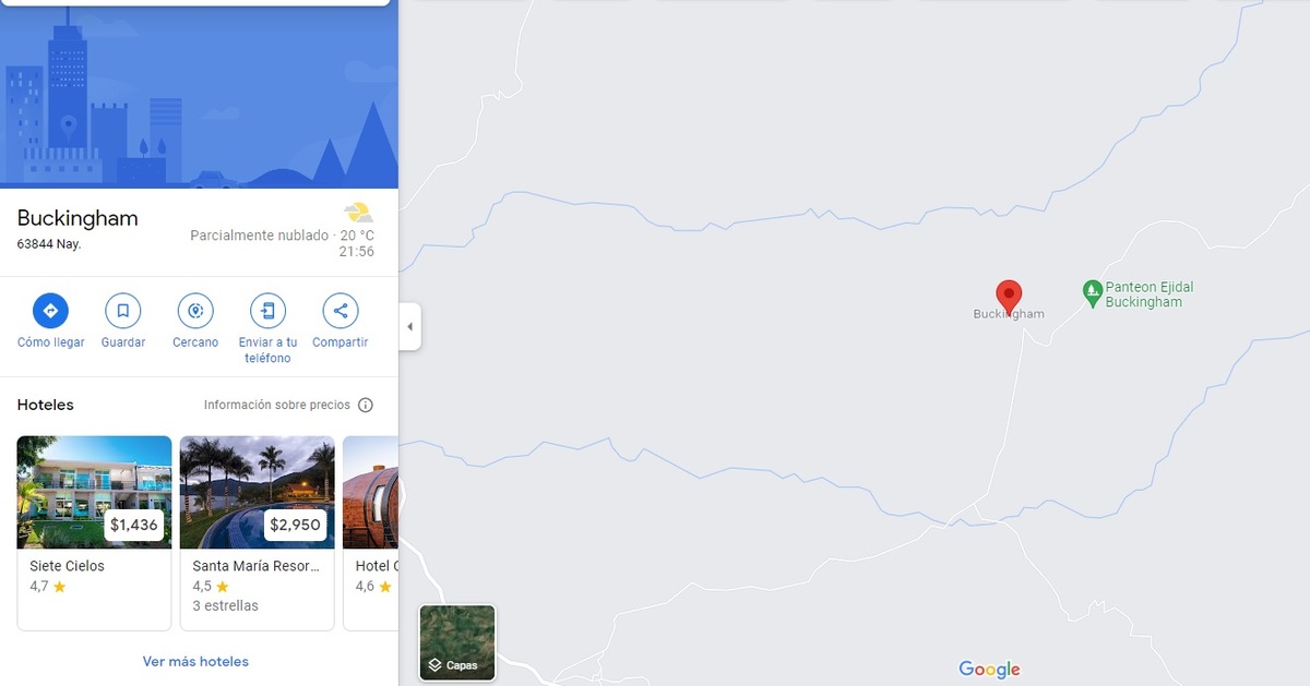 Buckingham se encuentra a 30 minutos del Volcán las navajas y a menos de una hora de Tepic, Nayarit, por lo que es un destino ideal. A pesar de qué este pueblo lleva un hombre que se relaciona con el emblemático palacio de Inglaterra, no tiene nada que ver con esto.