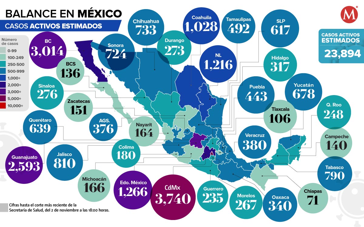 Ciudad de México sigue siendo el estado con más contagios, reportando 3 mil 740; Baja California es el siguiente con 3 mil 014, en Guanajuato hay 2 mil 593, el Estado de México suma mil 266, y Nuevo León contabiliza mil 216.