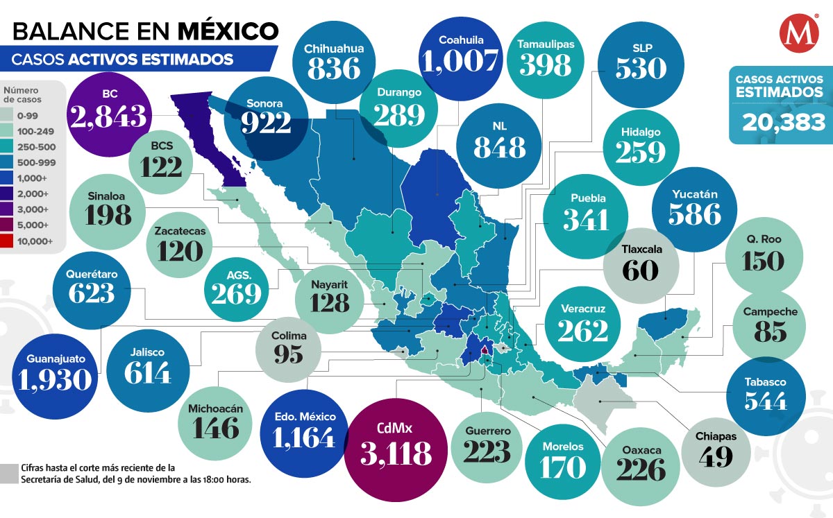 Ciudad de México vio un aumento de 526 casos, el Estado de México contabilizó 188, en Nuevo León hay 155 nuevos contagios, mientras que en Guanajuato se registraron 370, haciendo un total de 191 mil 196; por último, Jalisco sumó 108. Baja California, que sigue como el único estado en semáforo epidemiológico naranja, reportó 502 contagios.