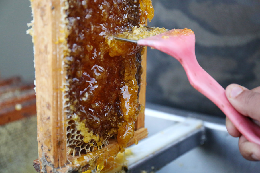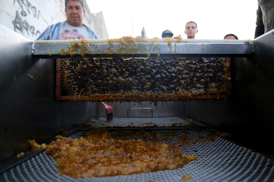 El siguiente proceso es dejar escurrir la miel en un recipiente con filtro para empezar a extraer el producto por gravedad. Después, de manera centrífuga, se colocan los bastidores con los opérculos listos en un recipiente cilíndrico, a fin de que la miel sea separada de la cera del panal al girar manualmente el recipiente.