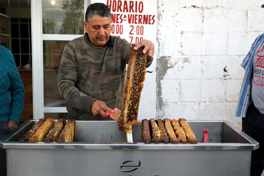 “Debido a que hay mucha gente que llega al local y pregunta si es miel natural, nos dimos a la tarea de mostrarles una demostración del proceso de extracción y que lo vean con sus propios ojos y prueben una buena miel de abeja”, señaló el productor de miel, la cual cosechan en terrenos cercanos a Guadalupe Victoria, Durango, así como en Matamoros, Coahuila.