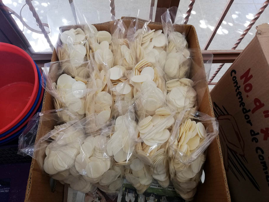 Para que no se doble la hostia las ponen en un recipiente de plástico tipo colador para que se sequen, luego las seleccionan y las embolsan para su venta.