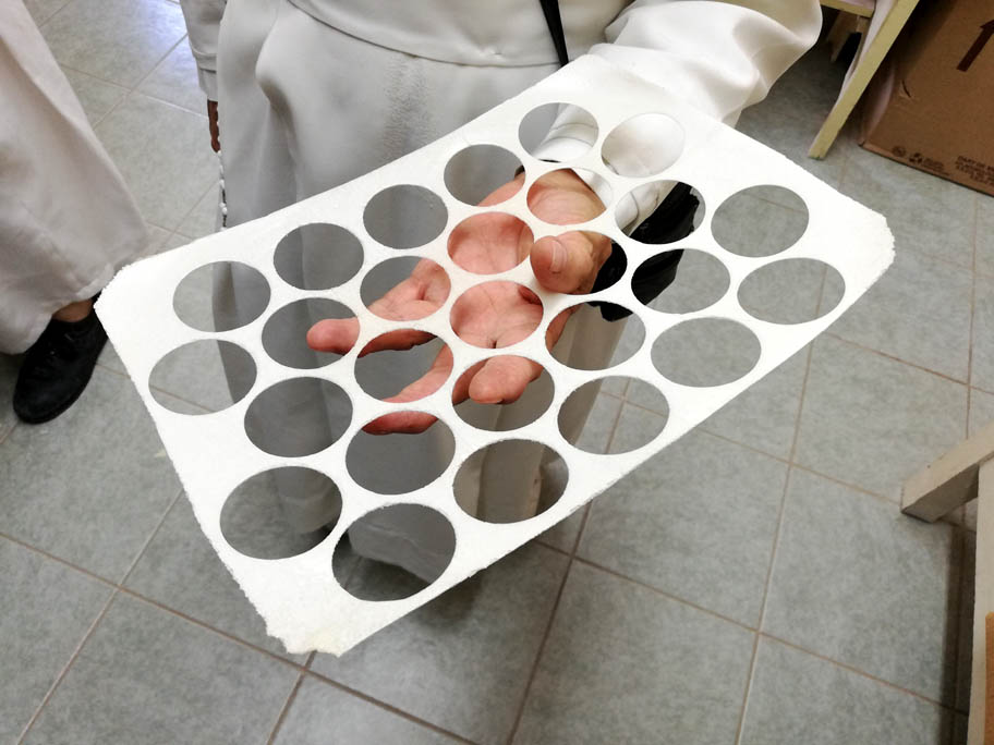 La mediana también es usada para las custodias y la pequeña, es la normal para los fieles, "son por lo general cuatro tamaños, tenemos un cortador que tiene placas con 27 orificios para cortar las hostias en un sólo proceso".