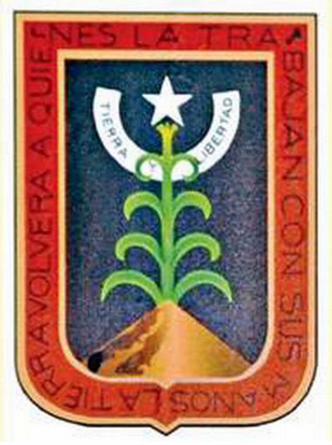 También en color plata, en el marco del emblema está una banda con la leyenda "La tierra es de quienes la trabajan con sus manos"; este marco se complementa con un filo verde al interior y otro rojo al exterior del escudo.
