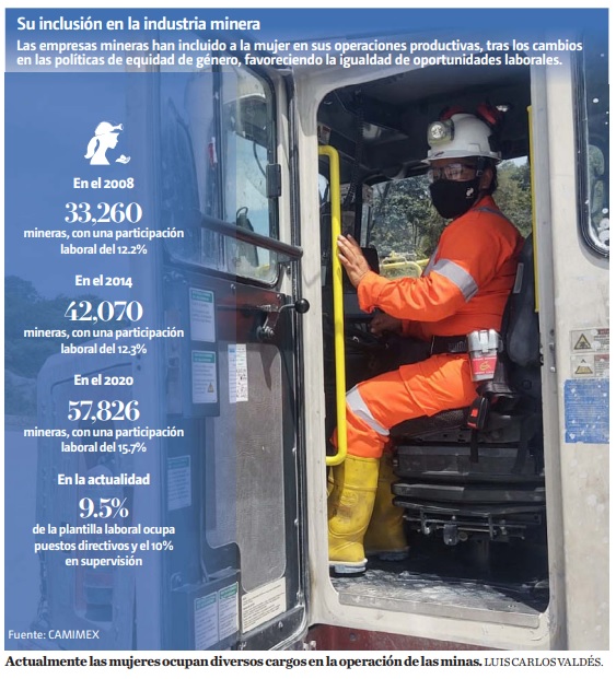 En el 2008 la participación de la mujer en la minería fue del 12.2% con 33 mil 260 mineras. Para el 2014 el porcentaje sólo se elevó un punto, es decir, 42 mil 070 empleadas, con una colaboración del 12.3%. En el 2020, la cifra alcanzó el 15.7% con un total de 57 mil 826 trabajadoras dentro de las unidades mineras.