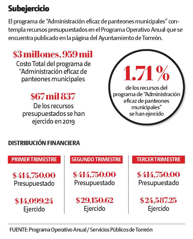 En el Programa Operativo Anual de la “Administración Eficaz de Panteones” que depende de Servicios Públicos en el municipio de Torreón, cayó en subejercicio en los tres trimestres de 2019, debido a que se le asignó la cantidad de 3 millones 959 mil pesos y hasta el momento, solo se han gastado 67 mil 837 pesos, lo anterior en base a la Ley Federal de Presupuesto y Responsabilidad Hacendaria.
