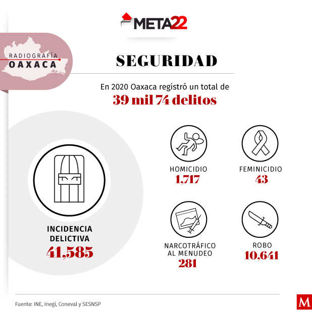 En 2020, en Oaxaca se cometieron mil 717 homicidios; 43 feminicidios; 113 delitos de extorsión; 2 mil 421 robos a vehículo, también mil 802 delitos sexuales y se detectaron 14 delitos de trata de personas.