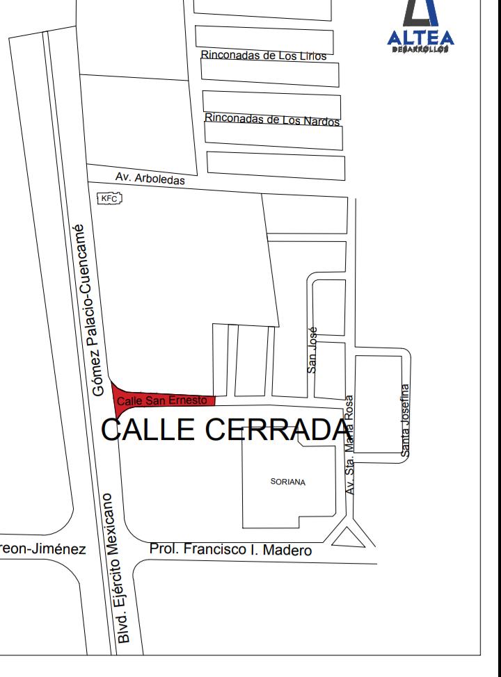 "Altea Desarrollos sigue avanzando con la construcción del centro comercial Paseo Gómez en coordinación con las autoridades correspondientes de la misma entidad y su siguiente paso consiste en comenzar con los trabajos sobre una fracción de la calle San Ernesto por lo que a partir de hoy la calle procederá a cerrarse ofrecemos una disculpa por los inconvenientes que esto pueda causarles" , dice el comunicado de la empresa.