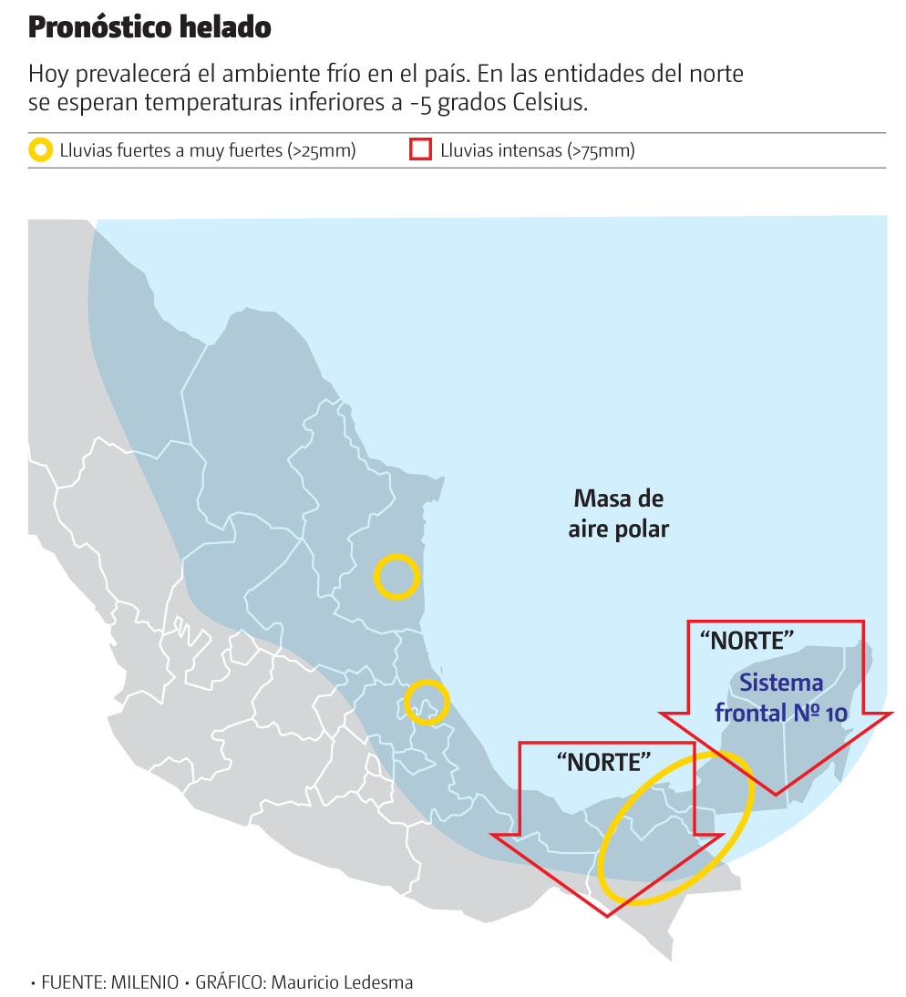 En las zonas altas de Hidalgo, Edomex, CdMx, Puebla, Tlaxcala, Veracruz y la Sierra Norte de Oaxaca existe la posibilidad de que caiga nieve o aguanieve. Además habrá tormentas fuertes de corta duración en Campeche, Michoacán y Guerrero.