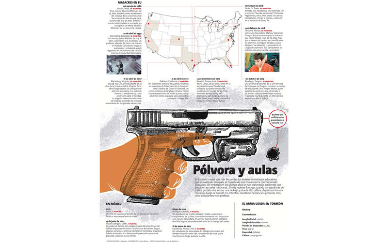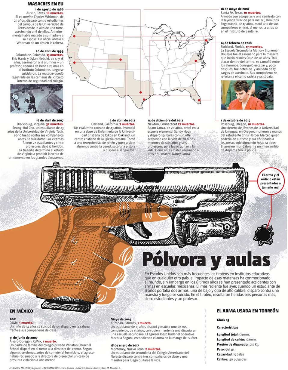 Salió del baño uniformado y armado. Su maestra, al notar la demora del menor, salió a buscarlo y lo encontró en el patio, a un lado de los baños. Para ese momento eran las 8:30 y lo invitó a regresar al salón, pero él volteó y le disparó.